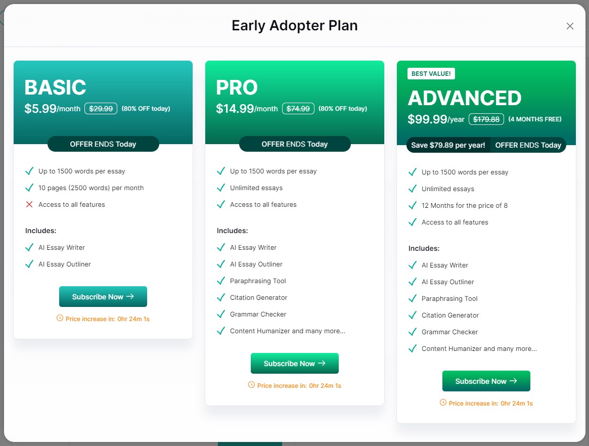 MyEssayWriter.ai understands the diverse needs of its users and offers flexible pricing plans: